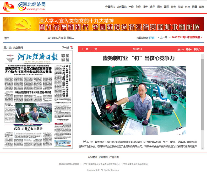 9月18日,《河北經(jīng)濟(jì)日報(bào)》頭版要聞《隆堯制釘業(yè)“釘”出核心競爭力》中刊登了青龍劍公司及隆堯制釘行業(yè)近年來的發(fā)展情況。青龍劍公司不斷提高配置與整合效率,也不斷提升產(chǎn)品和服務(wù)的價(jià)值,從而提升我們的核心競爭力。