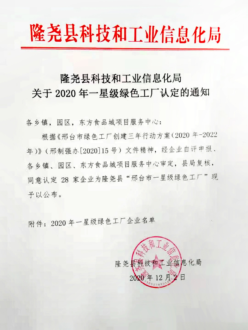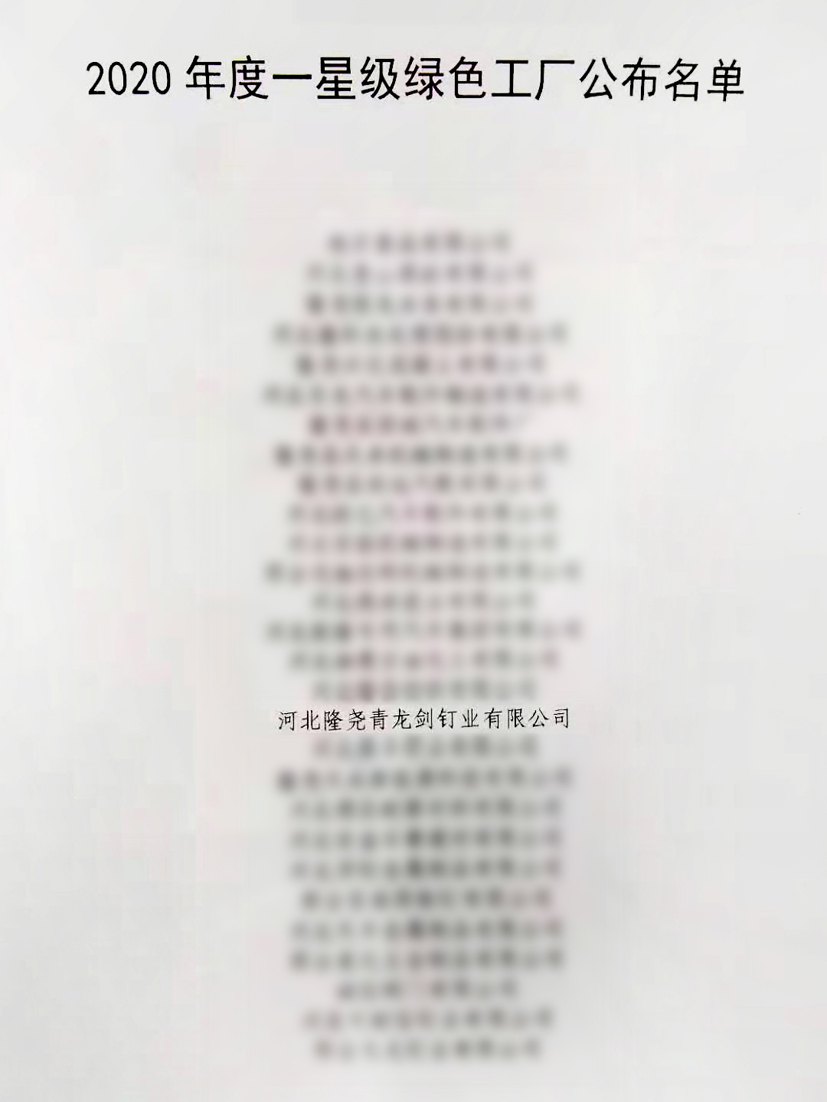 2020年12月2日,工信部印發根據《邢臺市綠色工廠創建三年行動方案(2020年-2022年)》(邢制強辦【2020】15號)文件精神,河北隆堯青龍劍釘業有限公司被評定為"邢臺市一星級綠色工廠"。
