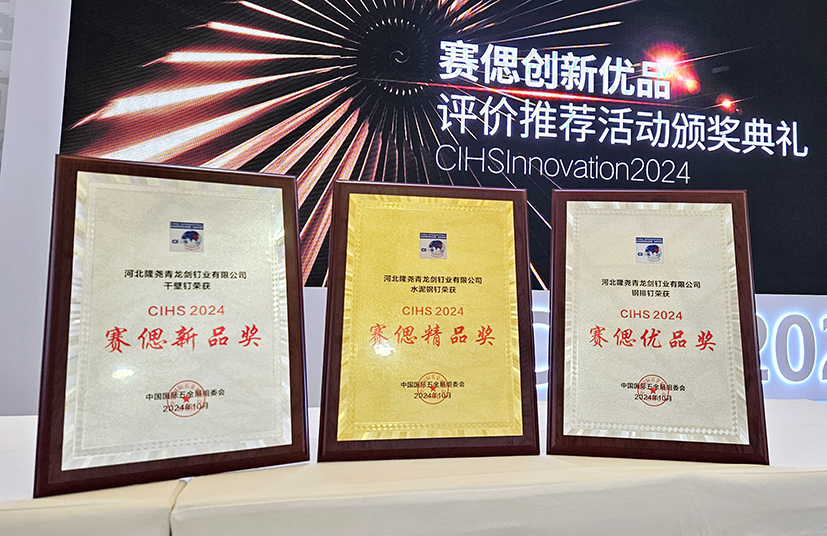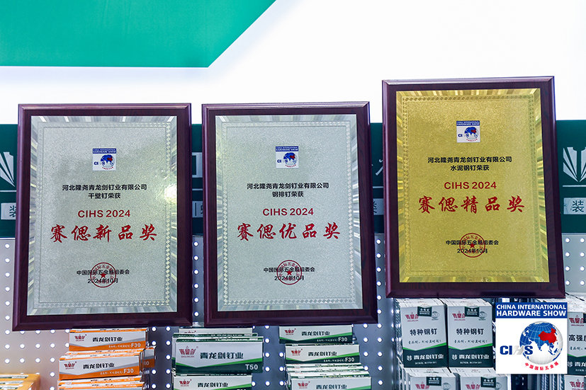 中國國際五金展(CIHS)為全球五金行業提供一站式的采購商貿平臺,吸引了來自世界各地的行業領軍企業和專業人士參與。此次參展的鋼釘、氣動釘、螺絲、鉆尾等多系列產品中,青龍劍水泥鋼釘、鋼排釘、干壁釘三款產品憑借卓越的品質,在眾多產品中脫穎而出,分別榮獲“CIHS2024賽偲精品獎”、“CIHS2024賽偲優品獎”以及“CIHS2024賽偲新品獎”三大獎項,彰顯了公司在釘類產品領域的領先地位。