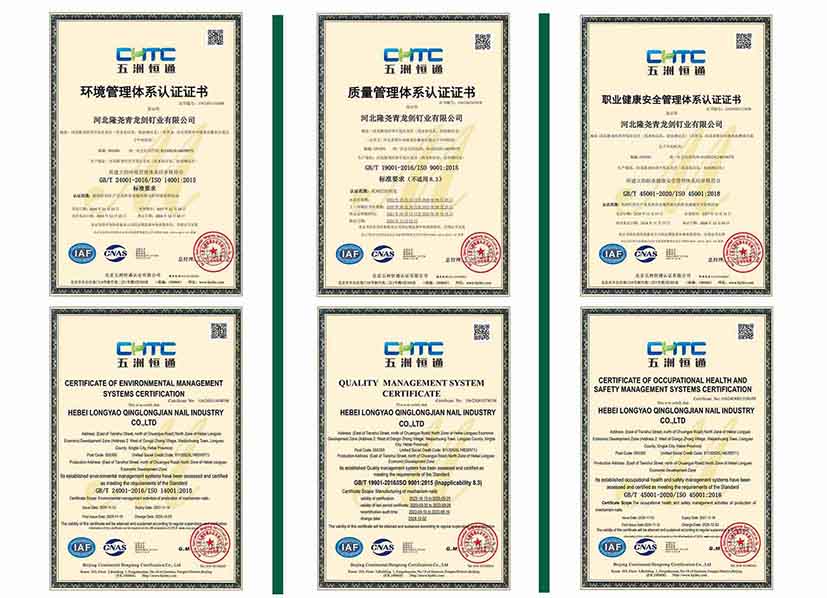 公司始終以“讓勞動(dòng)創(chuàng)造更多價(jià)值”為企業(yè)理念,致力于生產(chǎn)優(yōu)質(zhì)高效的釘類產(chǎn)品。本次通過(guò)科學(xué)的管理體系和方法,不斷提升產(chǎn)品質(zhì)量與服務(wù)水平。此次公司通過(guò)了多項(xiàng)體系認(rèn)證,標(biāo)志著青龍劍公司一直保持符合國(guó)際標(biāo)準(zhǔn)化的管理體系要求,進(jìn)一步鞏固了青龍劍在行業(yè)中的領(lǐng)先地位。